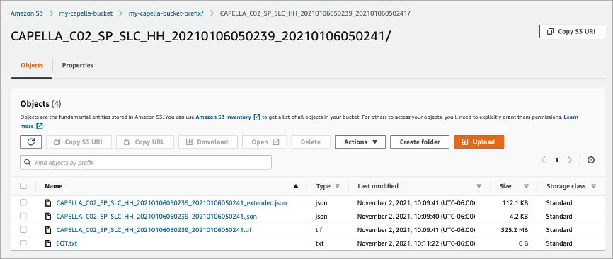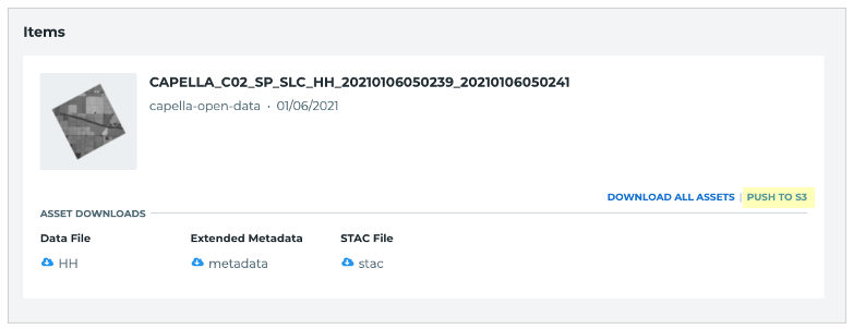 For tasking requests, all imagery assets are automatically pushed to the Active customer managed AWS S3 bucket(s) when Push to S3 is enabled for the organization (no additional manual step required). All imagery assets are pushed to the S3 bucket within a folder named by the STAC ID of the image (same file structure as the zip download). Additionally, an empty EOT.txt file is uploaded at the end to reflect that the push is complete. This is helpful to use as a trigger when programmatically automating workflows.